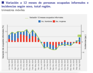 Finalmente, el INE informó que la tasa de ocupación informal alcanzó un 29,0%, con un alza de 0,3 puntos en doce meses. Las personas ocupadas informales aumentaron en 2,3%, cifra explicada principalmente por los hombres (8,5%) y por los asalariados informales (7,8%).
