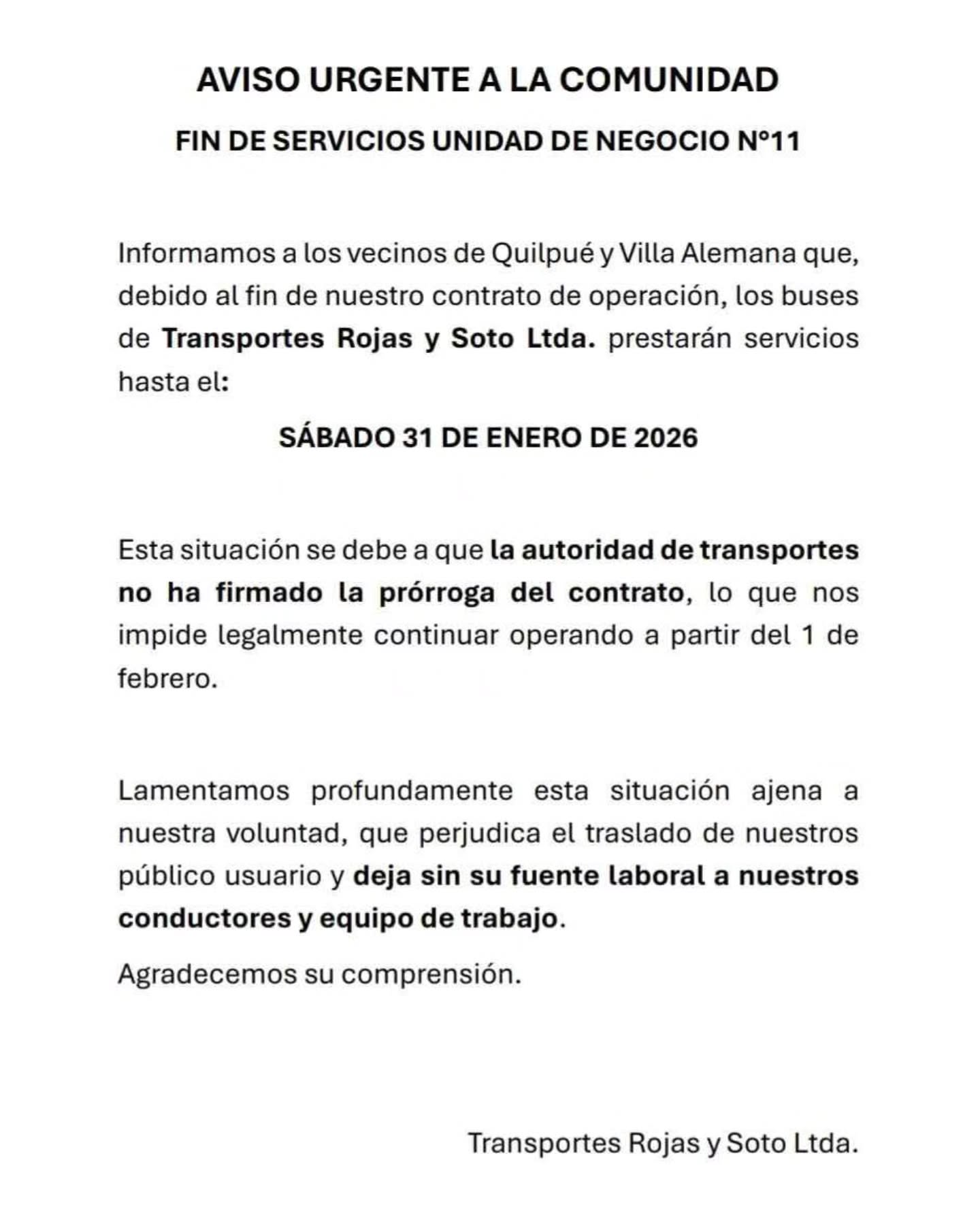 Desde la empresa explicaron que esta situación se debe a que la autoridad de transportes aún no ha firmado la prórroga del contrato que permite el funcionamiento de estos recorridos, los que cumplen un rol clave en la conectividad diaria entre Quilpué y Villa Alemana.